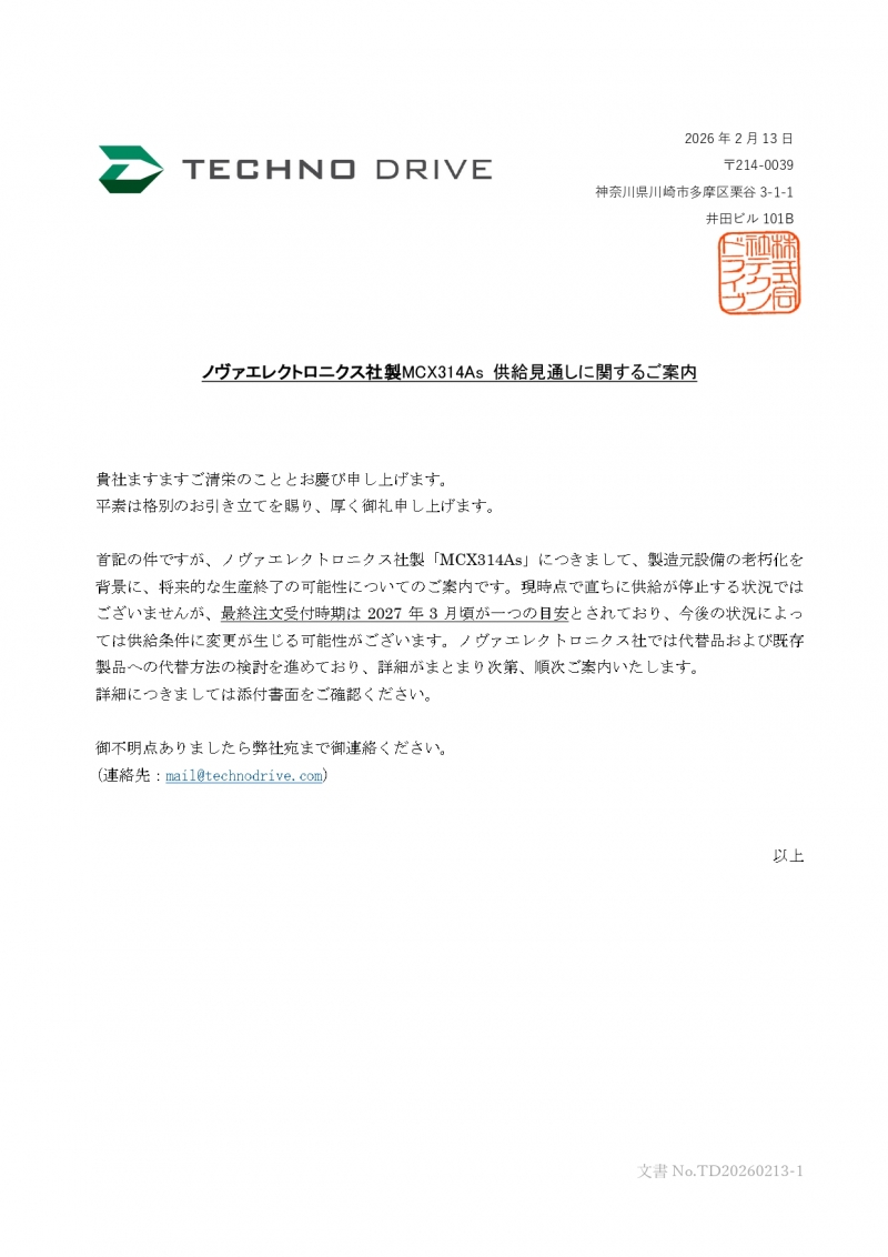 ノヴァエレクトロニクス社製MCX314As 供給見通しに関するご案内 TD20260213-1