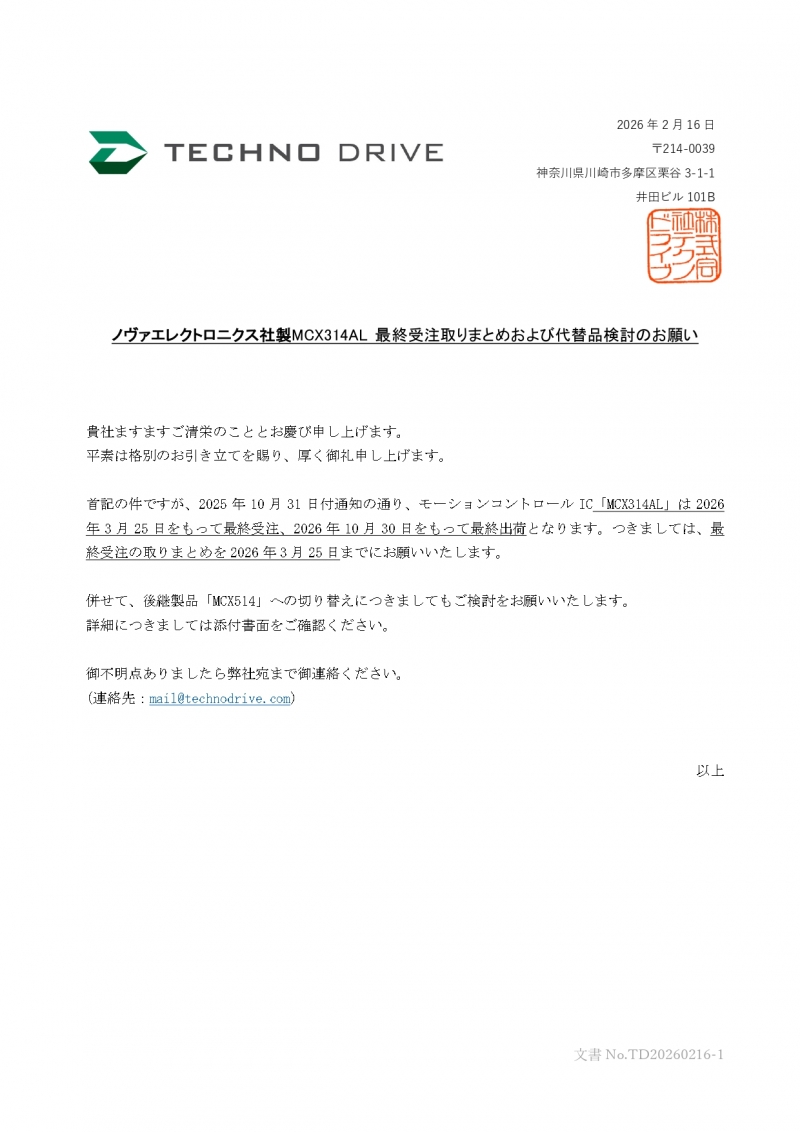ノヴァエレクトロニクス社製MCX314AL 最終受注取りまとめおよび代替品検討のお願い