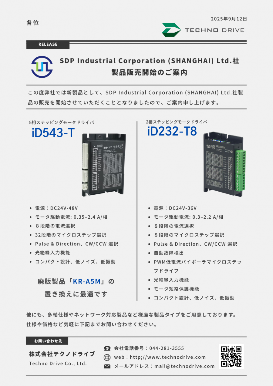 SDP Industrial Corporation (SHANGHAI) Ltd.社製品販売開始のご案内